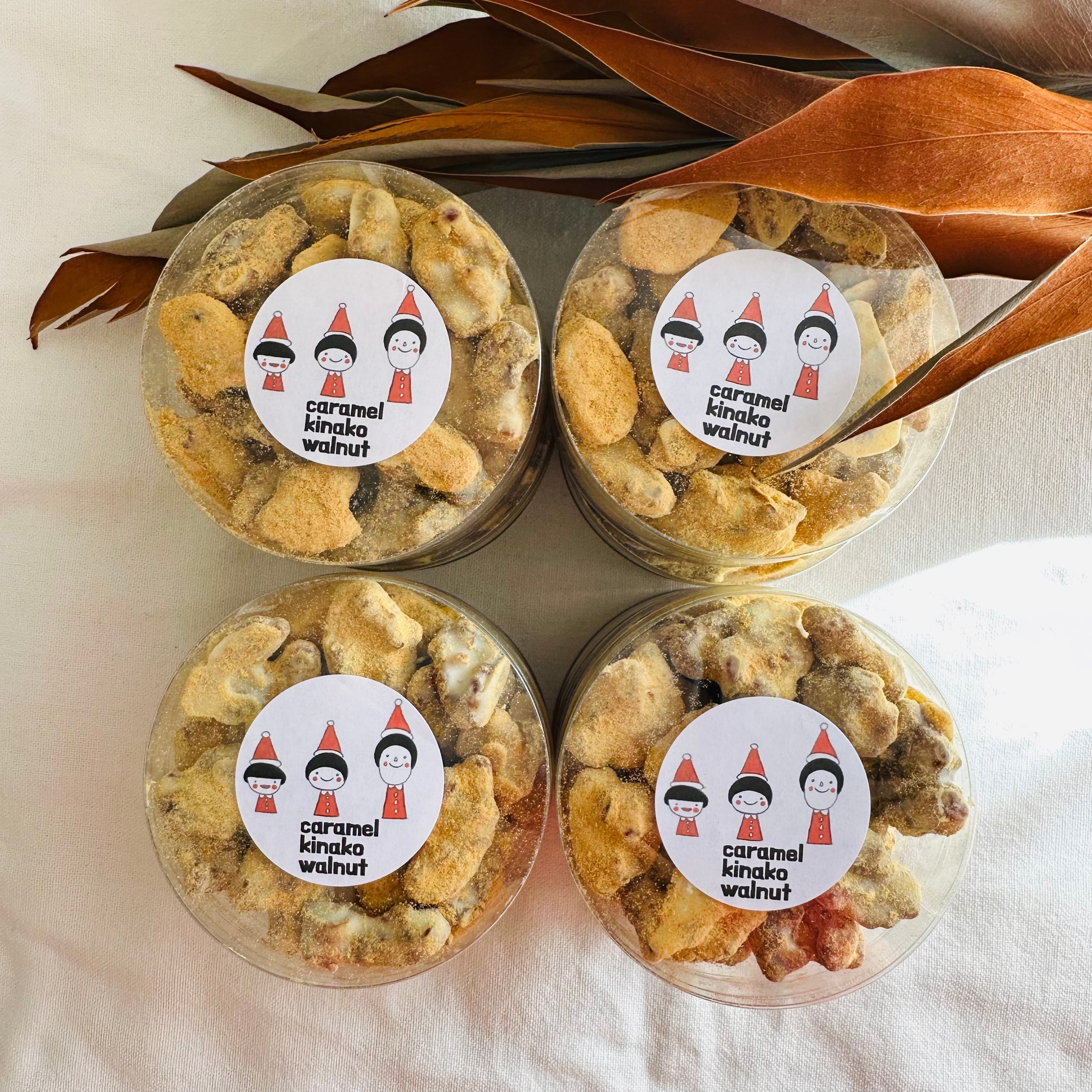 1番圧搾油でローストしたウォールナッツをグラスフェドバターときび砂糖で作ったほろ苦いカリカリのキャラメルを纏わせホワイトチョコときなこをかけました。
